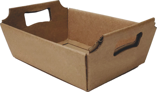 Caixa organizadora de papelão, aberta, com design simples e funcional. Possui laterais recortadas que servem como alças para facilitar o transporte.